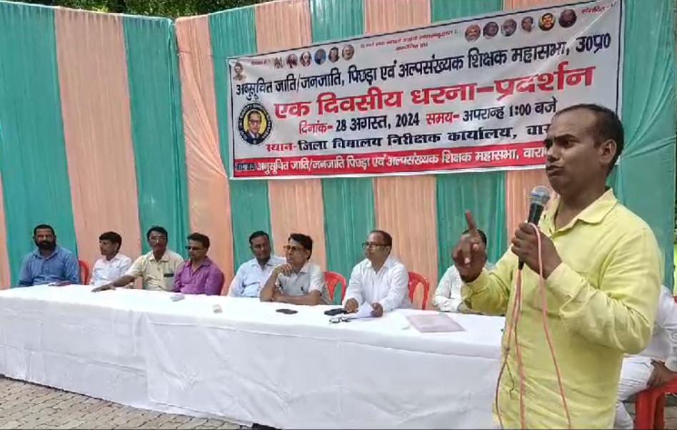 अनुसूचित जाती जनजाति पिछड़ा एवं अल्पसंख्यक शिक्षक महासभा वाराणसी द्वारा उत्तर प्रदेश में शिक्षको की विभिन्न समस्याओं को लेकर एक दिवसीय धरना प्रदर्शन जिला विद्यालय निरीक्षक के कार्यालय पर किया गया