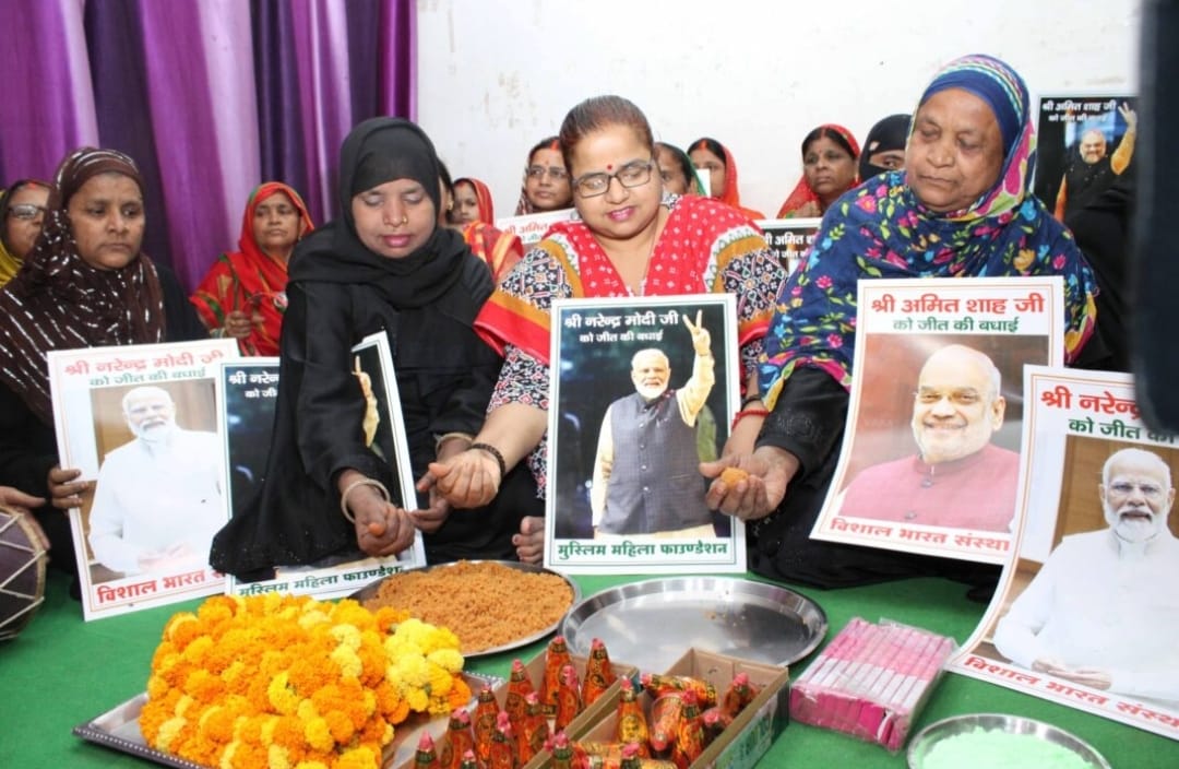 वाराणसी। नरेन्द्र मोदी की जीत से आश्वस्त विशाल भारत संस्थान ने जीत के जश्न की तैयारी शुरू कर दी। लमही के सुभाष भवन में जुटी मुस्लिम महिलाओं ने हिन्दू महिलाओं के साथ ढोल की थाप पर गीत गाकर लड्डू बनाये। 400 दीपक तैयार किये गए और आतिशबाजी करके विपक्षियों को संदेश दिया गया कि अबकी बार मोदी सरकार। इस अवसर पर नरेन्द्र मोदी और अमित शाह के पोस्टर प्रदर्शित किए गए। जीत का सेहरा प्रधानमंत्री मोदी और अमित शाह के सर पर बांधा। मोदी की आरती उतारी और नारे लगाए- अबकी बार मोदी सरकार, बहनों को मिलेगा और अधिकार। हम चलेंगे सीमा उस पार, पीओके पर होगा हमारा अधिकार।