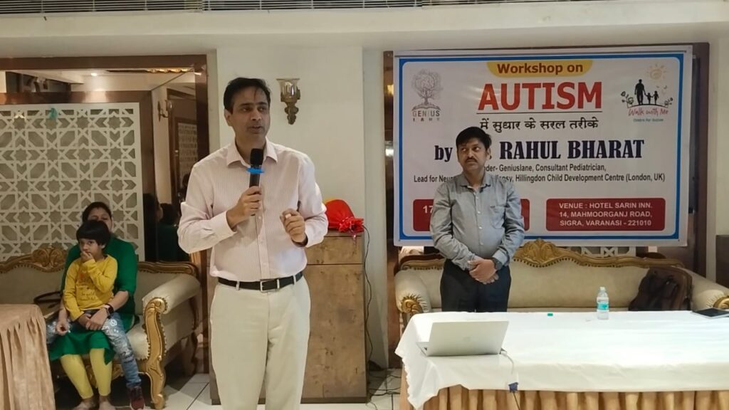 बाराणसी। एक दिवसीय आटिज्म कार्यक्रम के तहत रविवार को महमूरगंज स्थित होटल सभागार में आटिज्म में सुधार के सरल तरीके कार्यक्रम का वर्कशॉप का आयोजन किया गया। कार्यक्रम के मुख्य अतिथि एवं जीनियस. लेन कंसल्टेन्ट पेडीट्रीशयन के संस्थापक व यू०के० प्रसिद्ध चिकित्सक डा०राहुल भारत ने चाइल्ड न्यूरोलॉजी से सम्बन्धित सवाल का जवाब देते हुए कहा कि आटिज्म एक गम्भीर बीमारी नहीं है बल्कि इसको माता-पिता सही देखभाल व चिकित्सक से सलाह लेकर जल्द से जल्द ठीक किया जा सकता है। इसके लिए आटिज्म की जन जागरूकता कार्यक्रम जरूरी है। ये जितना जागरूकता होगा उतना जल्द इलाज संभव हो पायेगा। डॉ० राहुल भारत पिछले 10 वर्षों से इंडिया में आटिज्म पर बेहतरीन कार्य कर रहे है और वे चाईल्स न्यूरोलाजिस्ट के विशेषज्ञ चिकित्सक है। डॉ० भारत ने कहा कि अगर आपके बच्चे में मिर्गी, आटिज्म, पढ़ाई में परेशानी, अपने आप में गुमशुम अपना नाम बुलाने पर भी नहीं सुनना, अत्यधिक चंचलता या शरारतीपन, उम्र से कम व्यावहारिकता व समझ, अपनी उम्र के बच्चों से कम घुलना-मिलना आदि उपरोक्त में से कोई भी दिमागी व व्यवहार सम्बन्धित समस्या है तो तत्काल चिकित्सक से इलाज के लिए जानकारी ले। वाक वीथ मी (सेंटर फार आटिज्म) की फाउण्डर व डायरेक्टर डा० नीलम यादव ने आटिज्म पर विधिवत प्रकाश डाला।