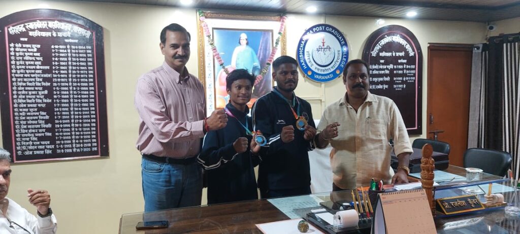 Varanasi: महाविद्यालय के लिये बहुत ही हर्ष का विषय है कि, ऑल इंडिया क्वान कि डो चैंपियनशिप जेजेटी यूनिवर्सिटी झुंझुनू राजस्थान में 25 से 28 अप्रैल 2024 को सम्पन्न हुआ जिसमें हरिश्चंद्र स्नाकोत्तर महाविद्यालय, वाराणसी के विधि पंचम सेमेस्टर के छात्र उमेश केशरी ने गोल्ड मेडल प्राप्त किया और बी.ए. प्रथम सेमेस्टर के छात्र अरविंद कुमार ने रजत पदक प्राप्त किया। उक्त दोनों छात्रों को विश्वविद्यालय परिसर में कुलपति महात्मा गांधी काशी विद्यापीठ वाराणसी द्वारा सम्मानित किया गया तथा तथा हरिश्चन्द्र स्नातकोत्तर महाविद्यालय वाराणसी के प्राचार्य कार्यालय में हरिश्चंद्र महाविद्यालय के प्राचार्य प्रो॰ रजनीश कुँवर जी और खेल प्रभारी प्रो० संजय कुमार सिंह ने दोनों मेडलिस्ट को शिक्षकों एवं छात्रों की उपस्थिति में मिठाई खिलाकर भविष्य में ऐसी तरक्की करने की शुभकामनाओं के साथ बधाई दिया।