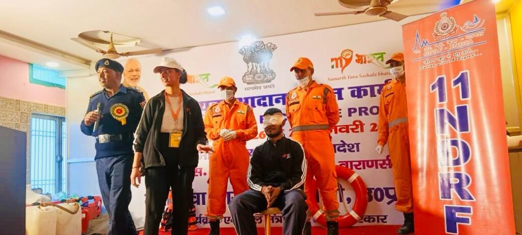 राकेश कुमार , इंस्पेक्टर, 11 बटालियन , ऐन डी आर एफ , वाराणसी , व उनकी टीम उपस्थित रही । जिला युवा अधिकारी यतेंद्र सिंह ने युवाओं का संबोधन करते हुए बताया कि आपदाएं किसी भी समय आ सकती है और उनसे निपटने की लिए युवाओं की कौशल प्रशिक्षण की आवश्यकता है जिससे कि युवा किसी भी असमान्य स्थिति में सभी समस्याओं और आपदाओं से निपट सकें । इसी क्रम में आगे अतिविशिष्ट अतिथि राकेश कुमार , इंस्पेक्टर, 11 बटालियन , ऐन डी आर एफ , वाराणसी ने सभी युवाओं को संबोधित करते हुए आपदा जैसे अग्नि , रस्सियो एवं बोरियों की मदद से स्ट्रेचर, जानवरो के काटने से , प्राथमिक उपचार आदि के समय में आपदा एवं चिकत्सा प्रबंधन प्रशिक्षण पर जोर दिया और विशेषज्ञों के सहयोग से व्यावहारिक प्रशिक्षण भी करके युवाओं को दिखाया गया जिससे कि आपदा समय में युवा नगण्य नुकसान के साथ उस आपदा से निपट सकें और युवाओं में नेतृत्व छमता विकसित हों जिससे युवाओं का सर्वगीण विकास हो सकेगा । हिमाचल प्रदेश के युवाओं ने भी उत्साहित होकर प्रतिभाग किया और आपदाओं से जुड़े अनेक पहलुओं के बारे में अपने विचार भी साझा किया और साथ ही अपने जिज्ञासा समाप्त करने के लिए ऐन डी आर एफ के विशेषज्ञों से कई सवाल भी किए । महिला प्रतिभागी शिल्पा भारद्वाज ने अपना निजी अनुभव साझा करते हुए कहा कि हिमाचल में हाल में हुई बाड़ जैसी घटनाओं को रोकने के लिए ऐन डी आर ऑफ़ का काम अत्यधिक उत्कृष्ट है और उनको मिली हुई देवदूत की उपाधि को भी सही बताया कार्यक्रम में हिमाचल राज्य से आए एस्कॉर्ट ऑफिसर तनीषा ठाकुर एवं राज कुमार , मेरा युवा भारत वाराणसी से जुड़े स्वयं सेवक राकेश यादव, राजेश विश्वकर्मा , एवं समाज सेवी डॉ नंद किशोर उपस्थित थे ।