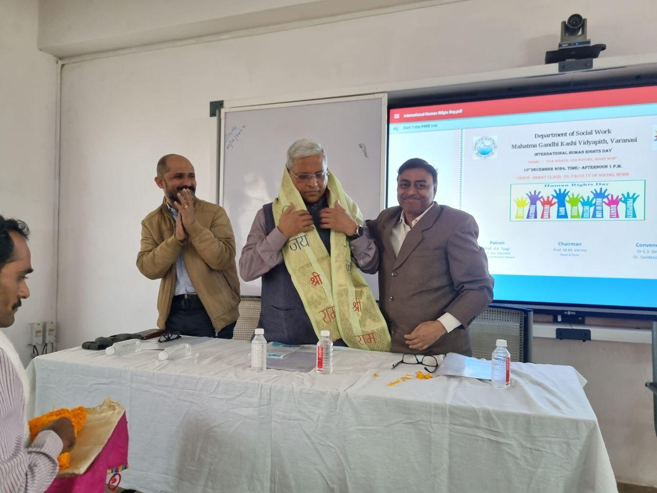 वाराणसी। समाज कार्य संकाय, महात्मा गांधी काशी विद्यापीठ में अंतर्राष्ट्रीय मानवाधिकार दिवस पर मंगलवार को एक संगोष्ठी का आयोजन किया गया। मुख्य अतिथि मैप्सवी के पूर्व अध्यक्ष प्रो. रामप्रकाश द्विवेदी ने भारत में मानवाधिकारों को लागू करवाने में महात्मा गांधी की महती की भूमिका पर प्रकाश डाला। उन्होंने कहा कि मानवाधिकारों की वैश्विक स्थापना में फ्रांसीसी क्रांति, रूसी क्रांति एवं अमेरिका की स्वतंत्रता से संबंधित क्रांतिकारी दस्तावेजों का महत्वपूर्ण योगदान है। गांधीजी ने भारत की राजनीतिक स्वतंत्रता के साथ ही देश से अश्पृश्यता एवं असमानता के निवारण तथा गरीबों के सामाजिक, आर्थिक उत्थान और सभी के लिए समान आर्थिक, सामाजिक व नागरिक अधिकारों की वकालत की, जो कि भारतीय संविधान के वैचारिक आधार बने।