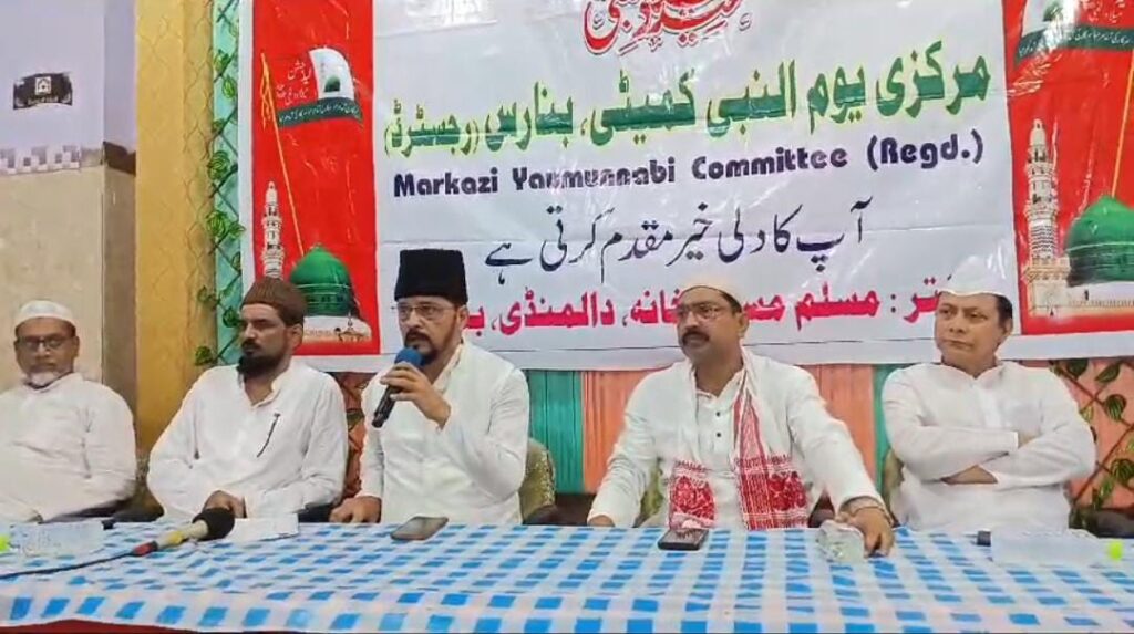 वाराणसी : दालमण्डी स्थित मुस्लिम मुसाफिर खाना में मरकज़ी यौमुन्नबी कमेटी के सदर एवं सिकेटरी की एक प्रेस वार्ता हर साल की तरह इस साल भी शहर के प्रसाशनिक अधिकारियों और जिम्मेदार लोगों के साथ सम्पन्न हुई। दिनांक 15 सितम्बर को जश्ने ईद मीलादुन्नबी के यादगार जुलूस के उठने पर चर्चा हुई मर्कज़ के जिम्मेदार साथियों ने गंगा जमुनी तहज़ीब के शहर में तमाम लोगों से पुरखुलूस गुज़ारिश की है कि इस यादगार जुलूस में शामिल हो कर शुक्रिया का मौका दें। कमेटी के लोगों ने प्रसाशनिक अधिकारियों से ये गुज़ारिश की है कि उस दिन ट्रैफिक सफाई एवं लाइट का मुकम्मल इन्तेज़ाम रखा जाये। जिस से इस यादगार जश्न को शानदार एवं खूबसूरत बनाया जाये।