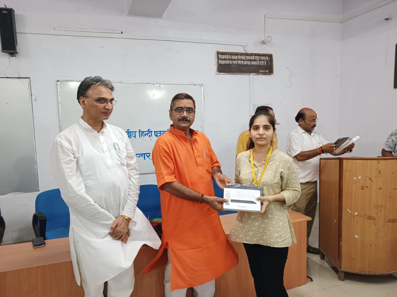 वाराणसी: पत्रकारिता एवं जनसंचार विभाग की ओर से शुक्रवार को प. मदनमोहन मालवीय हिंदी पत्रकारिता संस्थान में टैबलेट वितरण कार्यक्रम का आयोजन किया गया। उत्तर प्रदेश सरकार की डीजीशक्ति योजना के तहत टैबलेट वितरण कार्यक्रम के मुख्य अतिथि प्रदेश के पूर्व मंत्री और वर्तमान में विधायक डॉ नीलकंठ तिवारी ने एमए मास कम्युनिकेशन के विद्यार्थियों को टैबलेट वितरण कर समारोह का शुभारंभ किया। कुल 79 छात्रों को टैबलेट वितरित किये गये।