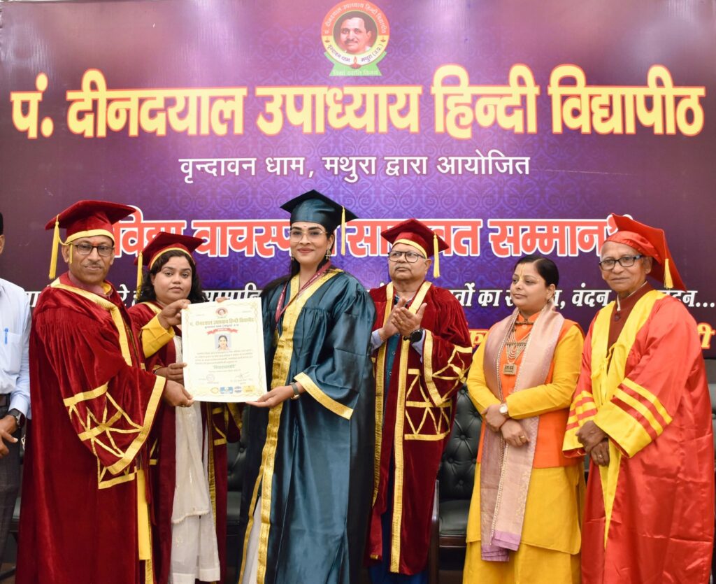 पं. दीनदयाल उपाध्याय हिन्दी विद्यापीठ, वृन्दावन धाम मथुरा (उ.प्र.) द्वारा “विद्या वाचस्पति सारस्वत सम्मान” से बलिया की गिनिज रिकार्डधारी एवं “पुण्यं फाउंडेशन” की फाउंडर डॉ. नेहा सिंह को उनके आठ हिन्दी पुस्तकों के लिए सम्मानित किया गया |