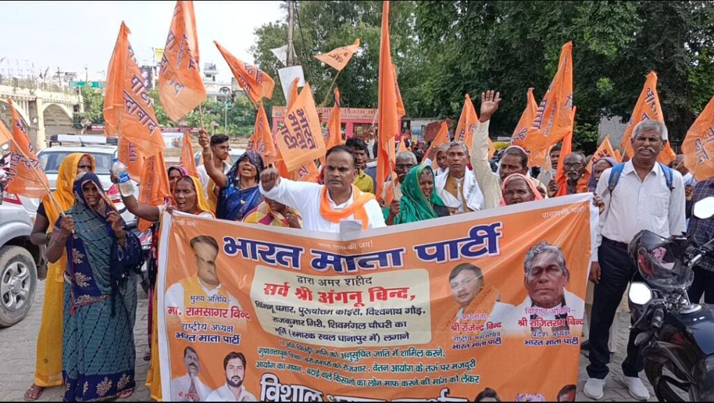 वाराणसी: भारत माता पार्टी के तत्वाधान में धरना प्रदर्शन दिनांक 30 सितंबर को शास्त्रीय घाट पर सैकड़ों कार्यकर्ताओं व पदाधिकारियों समर्थकों ने अपने हाथों में झण्डा और मांगो का पोस्टर लेकर शास्त्री घाट पर पहुंचे सभा करके घाट से जुलूस के साथ नारे लगाते हुए जिला कलेक्ट्रेट पर निम्नलिखित मांग पत्र सौंपा।