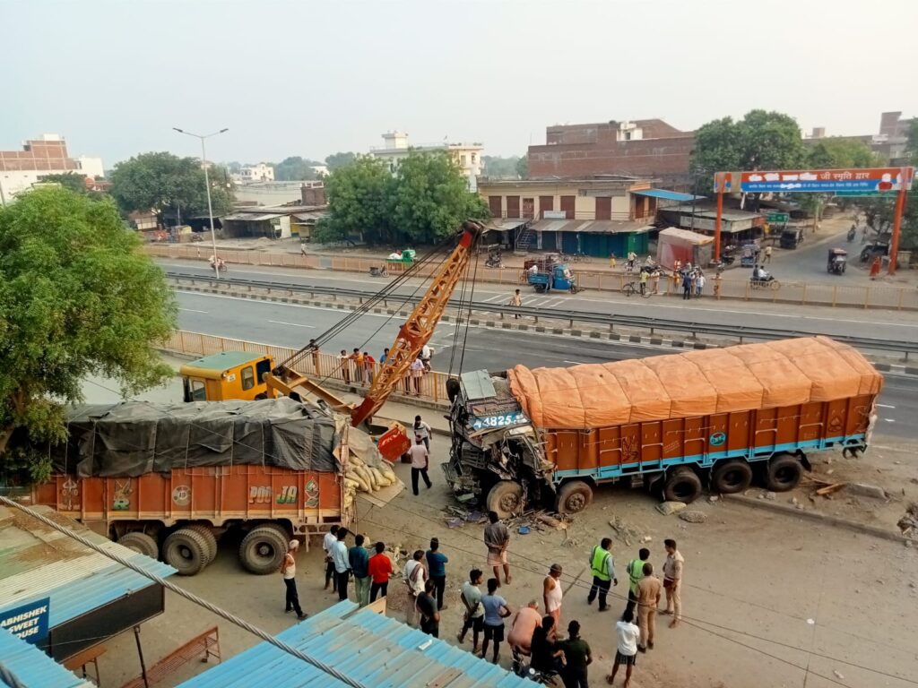 रोहनिया। मोहनसराय हाईवे स्थित चौराहे पर 4 बजे भोर में दो ट्रकों में भीषण एक्सीडेंट हो गई जिसके दौरान ड्राइवर तथा खलासी गंभीर रूप से घायल हो गये तथा ट्रक बुरी तरह क्षतिग्रस्त हो गया।हाईवे का रेलिंग तोड़ते हुए सर्विस रोड के किनारे फल की दुकान में ट्रक घुस गयी। ट्रक की चपेट में आने से सर्विस रोड पर खड़ी मोपेड बाइक दबकर बुरी तरह क्षतिग्रस्त हो गयी।घटना के दौरान ट्रक के केबिन में फंसे ड्राइवर तथा खलासी की चीख पुकार सुनकर स्थानीय लोगों के सूचना पर पहुचे हाईवे पेट्रोलिंग व क्रेन की मदद से मोहनसराय चौकी इंचार्ज राहुल रंजन ने गंभीर रूप से घायल ड्राइवर तथा खलासी को बाहर निकलवा कर हाईवे की एंबुलेंस से इलाज के लिए बीएचयू स्थित ट्रामा सेंटर भेजा।बगल में चाय की दुकान पर चाय पी रहे बढ़ईनी कला निवासी हरिशंकर गौड़ उर्फ मोछू बाल बाल बचे लेकिन उनका सर्विस रोड पर खड़ी मोटरसाइकिल ट्रक के पहिए से दबकर हुई बुरी तरह क्षतिग्रस्त हो गयी।