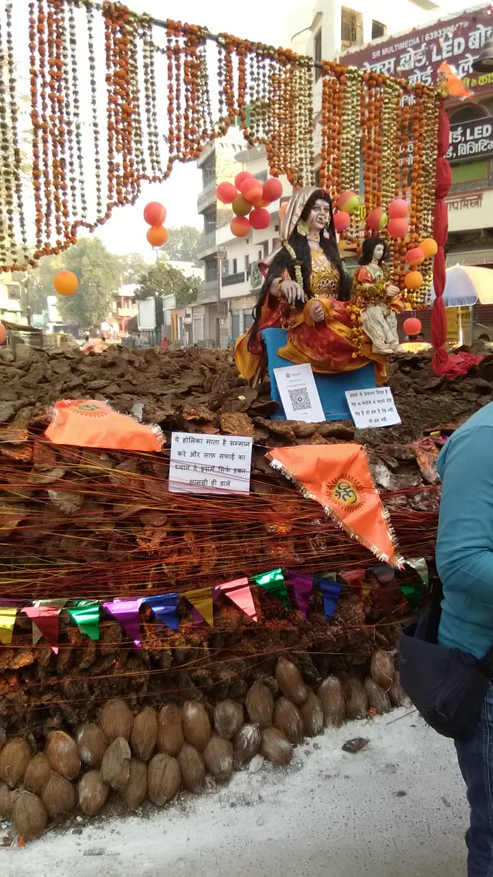 भोजूबीर।यूपी० कालेज जाने वाले तिराहे पर स्थापित होलिका लोगों के आकर्षण का केंद्र बना हुआ है। स्थानीय युवाओं एवं स्थानीय व्यापारियों के द्वारा सहयोग से होलिका लगाने का कार्य इसी तरह कई वर्षो से चला आ रहा है। विगत कई वर्षों की भांति इस वर्ष भी होलिका माता की मूर्ति रखा कर चारों ओर गोबर के उपले एवं फूलों माला से सजावट कर अनोखी होलिका स्थापित की गई है। पूरी तरह गोबर के गोहरी से होलिका लगाकर एक श्लोक लिखकर समाज को पेड़ न कटने के लिए प्रेरित किया है। “न पेड़ काटेंगे न कटने देगे। पेड़ है तो हम हैं पेड़ नही तो हम नही। इस विशालकाय होलिका की गोद में प्रहलाद की मूर्ति भी बनाई गई है जो आकर्षण का केंद्र बना हुआ है।