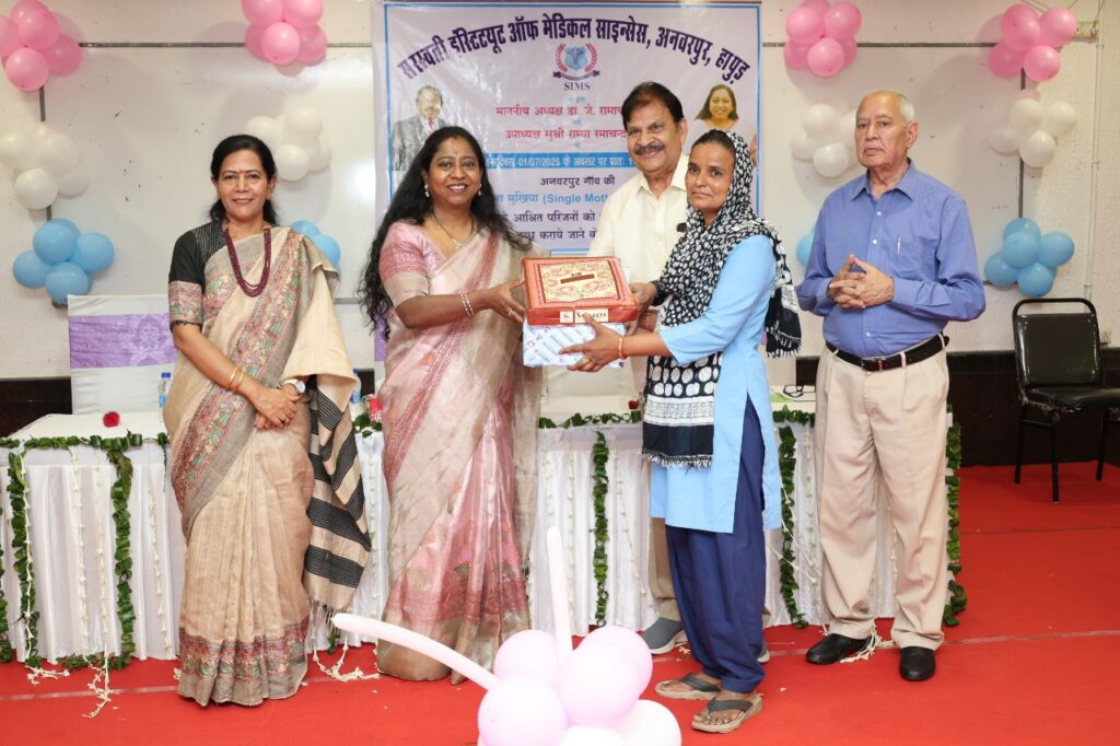 हापुड़ (मनीष कुमार) मंगलवार को संस्थान के अध्यक्ष डॉ० जे० रामाचन्द्रन व उपाध्यक्षा रम्या रामाचन्द्रन के जन्मदिन के अवसर पर सरस्वती इन्स्टीटयूट ऑफ मेडिकल साइसेस द्वारा कार्यक्रम का आयोजन किया गया इस अवसर पर संस्थान की उपाध्यक्षा रम्या रामाचन्द्रन ने ग्राम अनवरपुर की कुछ गरीब विधवा महिलाओं एवं उनके आश्रित (18 वर्ष तक के) परिजनों को एक वर्ष तक मुफ्त चिकित्सा देने की घोषणा की है इस अवसर पर ग्राम अनवरपुर के ग्राम प्रधान नरेश सैनी एवं कुछ वरिष्ठ नागरिकों को सम्मानित भी किया गया इस अवसर पर संस्थान की उपाध्यक्षा राम्या रामाचन्द्रन, प्रधानाचार्य डॉ० बरखा गुप्ता, डॉ० आर के सहगल, डॉ० जे०के० गोयल, डॉ० वाई०सी० गुप्ता फार्मेसी कॉलिज के प्रधानाचार्य डॉ० नितिन कुमार, नर्सिंग कॉलिज की प्रधानाचार्या मनोहरी, संस्थान के निर्देशक आर० दत्त, जनरल मैनेजर एन० वरधराजन एच०आर० मैनेजर डी० लुकरेशिया रूबावथी मैनेजर एव सभी वरिष्ठ चिकित्सकगण अधिकारीगण / कर्मचारीगण उपस्थित रहे।