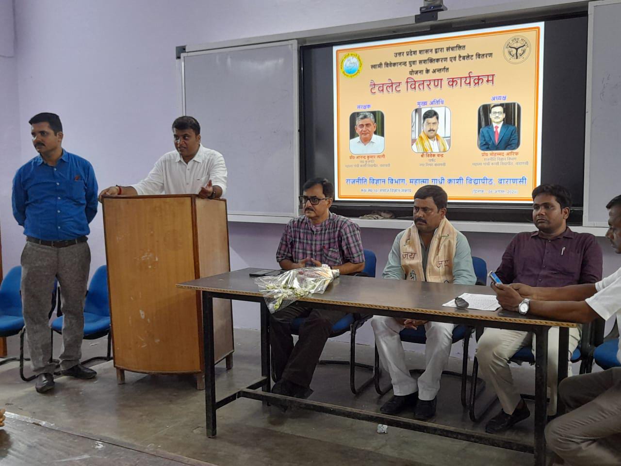 वाराणसी राजनीति विज्ञान विभाग, महात्मा गांधी काशी विद्यापीठ में मंगलवार को उत्तर प्रदेश शासन द्वारा संचालित स्वामी विवेकानंद युवा सशक्तिकरण अंतर्गत टैबलेट वितरण समारोह का आयोजन किया गया। कार्यक्रम में मुख्य अतिथि वाराणसी नगर निगम के पार्षद विवेक चंद्र ने विभाग के परास्नातक के विद्यार्थियों को टैबलेट वितरित किया। मुख्य अतिथि ने कहा कि उत्तर प्रदेश सरकार द्वारा संचालित यह योजना युवाओं को सबल एवं सशक्त बनाने के लिए है। भारत सरकार की महत्वकांक्षी योजना डिजिटल इंडिया को मूर्त रूप प्रदान करने में एक प्रभावी कदम साबित होगा।