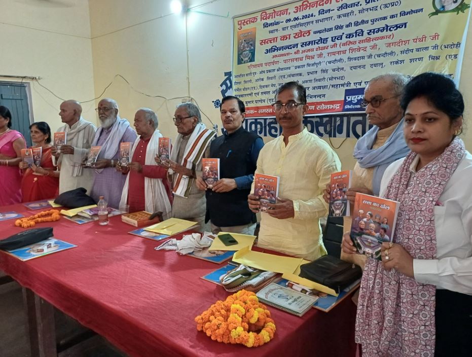 सोनभद्र। शहीद स्थल प्रवंधन ट्रस्ट करारी सोनभद्र के तत्वावधान में रविवार को पूर्वान्ह 11 बजे से राबर्ट्सगंज कचहरी परिसर स्थित सोनभद्र बार एसोसिएशन सभागार में वरिष्ठ साहित्यकार अजयशेखर की अध्यक्षता में अखिल भारतीय कवि सम्मेलन,सत्ता का खेल लेखिका चंद्रलेखा सिंह की दूसरी पुस्तक का विमोचन एवं समस्त अतिथियों व कवियों का सारस्वत अभिनंदन माल्यार्पण कर लेखनी पुस्तिका प्रशस्ति पत्र गांधी प्रतिमा साहित्य पुस्तकें देकर किया गया। कार्यक्रम का शुभारंभ वरिष्ठ साहित्यकार अजय शेखर द्वारा मां सरस्वती की प्रतिमा पर माल्यार्पण कर एवं दीप प्रज्ज्वलित कर किया गया।