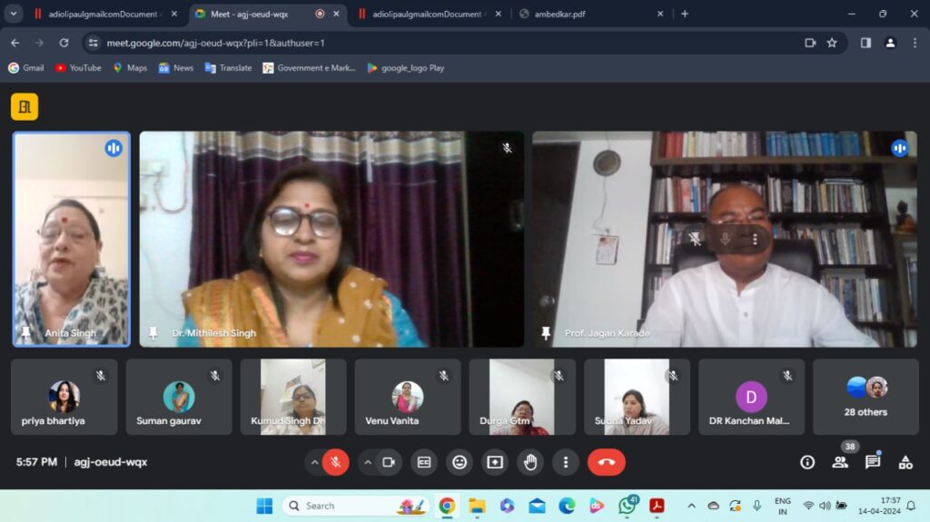 के विचारों को संबंद्ध करते हुए बताया कि शिक्षा में मानवीय मूल्यों के समावेशन पर अंबेडकर का मुख्य बल था। उन्होंने सामाजिक परिवर्तन का एक मुख्य अस्त्र शिक्षा को माना था। अंबेडकर न केवल पुरुष शिक्षा की बात करते हैं बल्कि उन्होंने स्त्री शिक्षा का भी पुरजोर समर्थन किया था ।शिक्षा के प्रति उनके लगाव का सबसे बड़ा प्रमाण यह है कि उनके गृह पुस्तकालय में 50000 से भी अधिक पुस्तके संग्रहीत थी। उनका विचार था कि शिक्षित बनो, चेतना पैदा करो और संगठित हो । कार्यक्रम की अगली कड़ी में IQAC समन्वयक प्रो. अनीता सिंह ने अंबेडकर जयंती पर उन्हें श्रद्धांजलि अर्पित करते हुए कहा कि अंबेडकर एक युगदृष्टा थे, उन्होंने धर्म से ऊपर मनुष्य को रखा और सर्व कल्याण की भावना से भारतीय संविधान का निर्माण किया ।