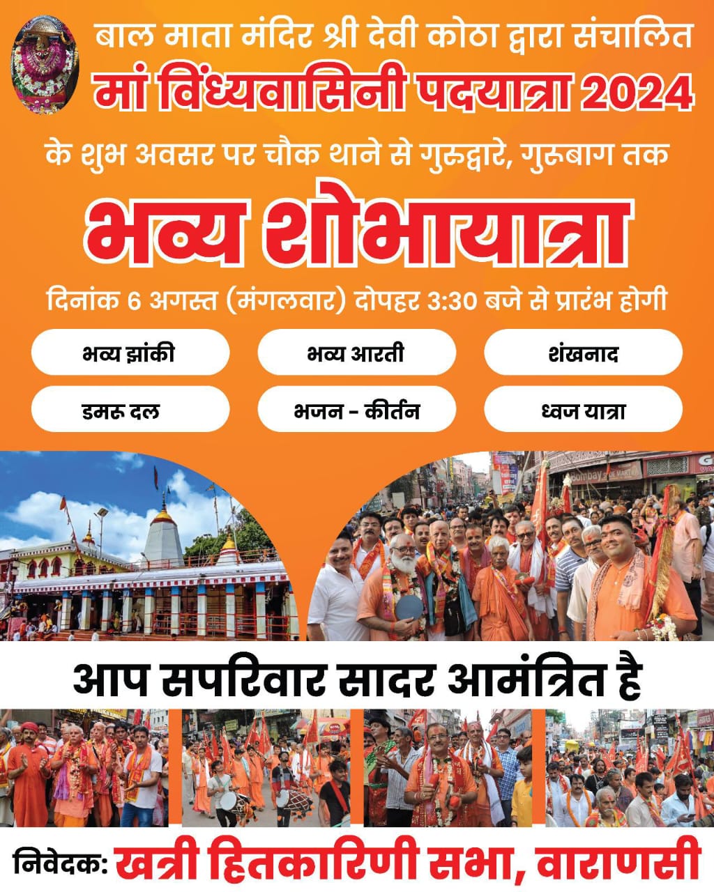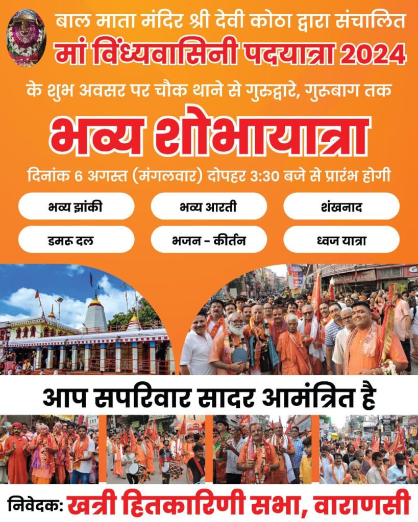 वाराणसी: मां विंध्यवासिनी पदयात्रा समिति वाराणसी द्वारा विगत सैकड़ो वर्षों से लगातार जारी विंध्यवासिनी पदयात्रा 6 अगस्त 2024 मंगलवार को यह यात्रा श्री बाल माता मंदिर देवीकोठा लक्खी से लगभग 11:00 बजे पूजन के उपरांत प्रारंभ होकर कुंज गली रानी कुआं मां भद्रकाली मंदिर में ज्योति पूजन करते हुए। मणिकर्णिका द्वार पर 3:30 बजे पहुंचेगी जहां से यह यात्रा भव्य शोभायात्रा यात्रा के रूप में ज्ञानवापी बांसफाटक गदौलिया गिरजाघर लक्सा होते हुए पवित्र गुरुद्वारे तक जाएगी जहां गुरुद्वारे में माथा टेक कर भक्त विंध्याचल धाम के लिए प्रस्थान करेंगे