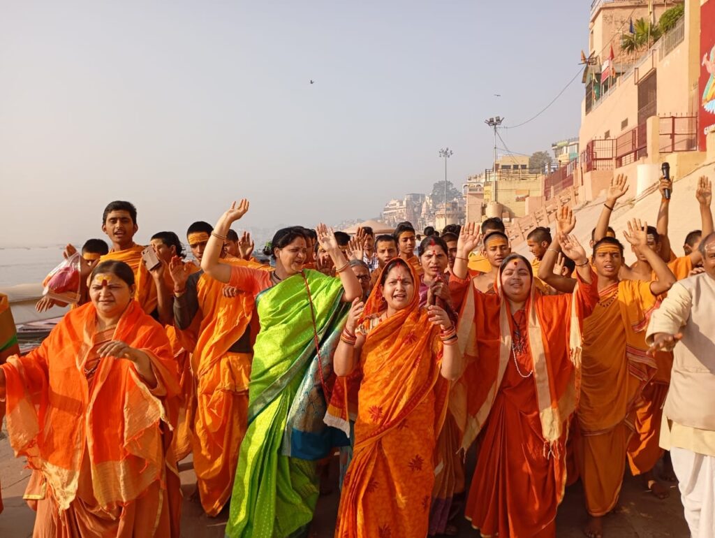 Varanasi: गौ माता को राष्ट्रमाता घोषित कराने हेतु प्रारम्भ गौमाता राष्ट्रमाता प्रतिष्ठा आंदोलन के अंतर्गत शंकराचार्य स्वामी अविमुक्तेश्वरानंद सररस्वती महाराज वृंदावन से दिल्ली तक कि पदयात्रा कर रहे हैं।शंकराचार्य महाराज के पदयात्रा के समर्थन में संपूर्ण राष्ट्र में सनातनधर्मी समर्थन पदयात्रा सहित विभिन्न कार्यक्रम आहूत कर रहे हैं।उसी क्रम में आज काशी में भी आध्यात्मिक उत्थान मंडल की मातृ शक्ति व जगदगुरु के वैदिक विद्यार्थियों ने परमपूज्या साध्वी पूर्णाम्बा दीदी के सान्निध्य में शंकराचार्य घाट से नमोघाट स्थित गोवर्धन मंदिर तक पदयात्रा निकाल कर सरकार से गौमाता को राष्ट्रमाता घोषित करने व गोकशी बंद कराने की एक स्वर से मांग की।