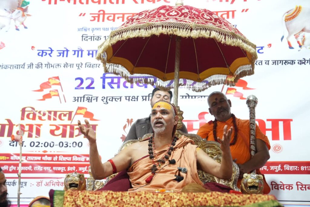भारत से गोकशी का कलंक मिटाकर गौमाता को राष्ट्रमाता घोषित कराने हेतु कृतसंकल्पित परमाराध्य परमधर्माधीश ज्योतिष्पीठाधीश्वर जगदगुरु शंकराचार्य स्वामिश्री: अविमुक्तेश्वरानंद: सरस्वती जी महाराज गौमतदाता संकल्प यात्रा के अंतर्गत आज जमुई पहुचने पर आहूत मतदाता संकल्प सभा मे उपस्थित गौभक्त जनसमुदाय से अपना उद्गार व्यक्त करते हुए कहा कि स्वतंत्र भारत मे गौहत्या भारतीयों के माथे पर सबसे बड़ा कलंक है।जिसे तत्काल दूर करने हेतु सनातनधर्मियों को कमर कस लेना चाहिए।गौहत्या रोकने में समर्थ नेता अपने निजी स्वार्थ हेतु हमारी गोकशी बन्द करने की मांग को लंबे समय से अनसुना कर रहे हैं।और हर तरह से प्रयास करने पर भी उनके कानों पर जूं नही रेंग रही है।इन सत्तालोलुप नेताओं का प्राण वोट में बसता है हमसब मिलकर जब इनके वोटबैंक पर हमला करेंगे तो ये बिलबिला कर गौहत्या बंदी का कानून पारित करेंगे।