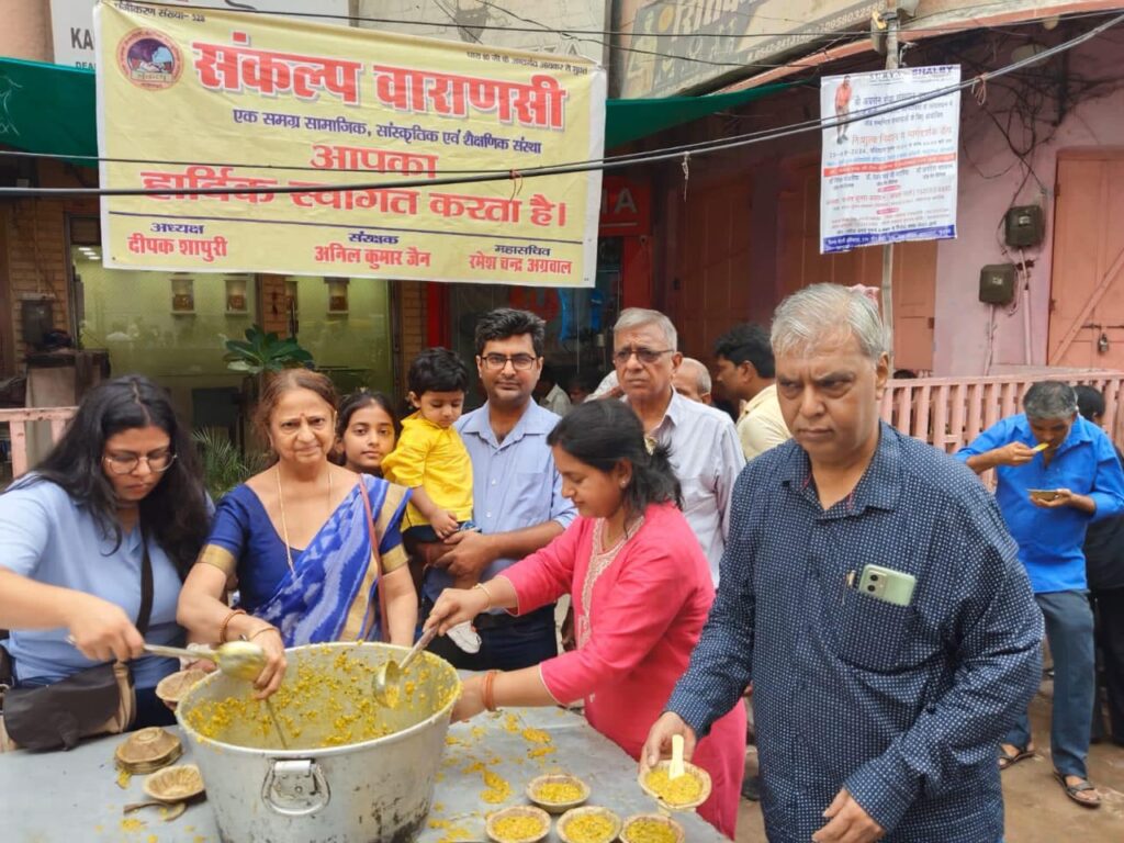 वाराणसी सामाजिक संस्था संकल्प द्वारा संचालित संकल्प अन्न क्षेत्र के तत्वाधान में शनिवार को चौक स्थित कन्हैया लाल गुलाल चंद सर्राफ के सामने श्रद्धालुओं श्रमिकों व व्यापारियों में प्रसाद खिचड़ी का वितरण किया गया। जिसका लाभ श्री काशी विश्वनाथ एवं मां अन्नपूर्णा के दर्शन को आने वाले श्रद्धालुओं क्षेत्र में काम करने वाले श्रमिकों एवं व्यापारियों ने प्राप्त किया।