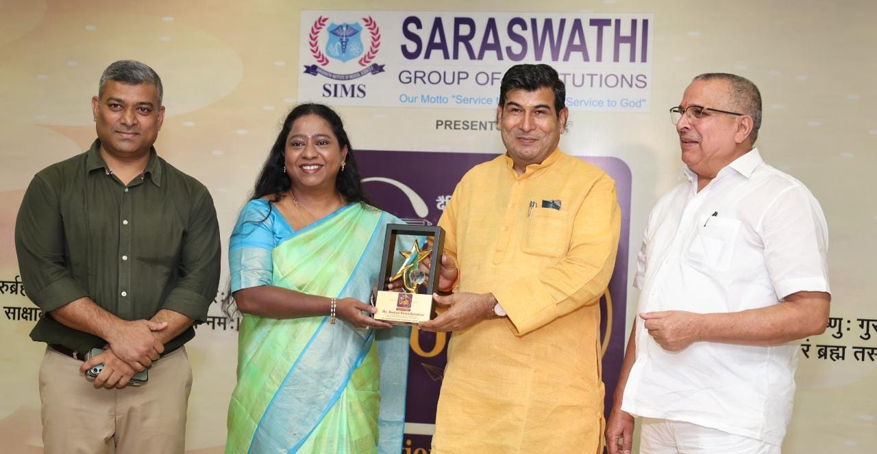 हापुड़ (मनीष कुमार) सरस्वती ग्रुप ऑफ़ इंस्टीट्यूशन्स के लिए यह अत्यंत गर्व का क्षण रहा जब गुरु प्रणाम कार्यक्रम के दौरान समूह की वाइस चेयरपर्सन रम्या रामचंद्रन को बेस्ट एजुकेशनलिस्ट एंड फिलांथ्रोपिस्ट अवॉर्ड 2025 से सम्मानित किया गया। यह पुरस्कार शिक्षा और समाज सेवा के क्षेत्र में उनके अद्वितीय योगदान की विशेष स्वीकृति है यह भव्य आयोजन दैनिक जागरण और सरस्वती इंस्टिट्यूट ऑफ मेडिकल साइंसेज़ (SIMS), हापुड़ द्वारा SIMS परिसर में संपन्न हुआ। इस अवसर पर शिक्षा के क्षेत्र में उत्कृष्ट योगदान देने वाले अनेक शिक्षकों और प्रधानाचार्यों को सम्मानित किया गया, जिससे समाज में शिक्षकों की अमूल्य भूमिका उजागर हुई गेस्ट ऑफ ऑनर रम्या रामचंद्रन, वाइस चेयरपर्सन, सरस्वती इंस्टिट्यूट ऑफ मेडिकल साइंसेज़, ने अपने गुरुजनों को नमन करते हुए कहा शिक्षक ही राष्ट्र निर्माण के असली शिल्पकार हैं। यह सम्मान केवल मेरा नहीं बल्कि उन सभी शिक्षकों का है जिन्होंने मुझे प्रेरणा और मार्गदर्शन दिया मुख्य अतिथि एमएलसी (शिक्षक संवर्ग) श्रीचंद शर्मा ने कहा“गुरु प्रणाम केवल एक कार्यक्रम नहीं बल्कि एक उत्सव है। शिक्षक विद्यार्थियों का भविष्य संवारकर देश की नींव मजबूत करते हैं सरस्वती ग्रुप ऑफ़ इंस्टीट्यूशन्स के चेयरमैन डॉ. जे. रामचंद्रन, प्राचार्या डॉ. बर्खा गुप्ता, फार्मेसी प्राचार्य डॉ. नितिन कुमार, नर्सिंग प्राचार्या डॉ. मनोहारी शशिधरण, सीनियर एडवाइज़र डॉ. आर.के. सेहगल, डिप्टी मेडिकल सुप्रीटेंडेंट डॉ. हर्ष सिसोदिया, निदेशक डॉ. आर. दत्त, निदेशक लीगल डॉ. आर.पी. सिंह, हॉस्पिटल एडमिन डॉ. वाई.सी. गुप्ता और एचआर मैनेजर सुश्री एल. रुबावथी सहित अनेक गणमान्य अतिथि उपस्थित रहे कार्यक्रम में हापुड़ जनपद के 40 से अधिक विद्यालयों के लगभग 150 से ज्यादा शिक्षकों और प्रधानाचार्यों को सम्मानित किया गया विशेष सम्मानित शिक्षक: एसडीए मिशन स्कूल, आरएसके इंटर कॉलेज, डीएवी पब्लिक स्कूल, सरस्वती बाल मंदिर, डीएम पब्लिक स्कूल सहित कई प्रतिष्ठित विद्यालयों के शिक्षक एवं प्रधानाचार्य जनरल मैनेजर श्री एन. वरधाराजन ने कहा, “गुरु प्रणाम जैसे आयोजन शिक्षकों को नई प्रेरणा और आत्मविश्वास प्रदान करते हैं। साथ ही सरस्वती ग्रुप ऑफ़ इंस्टीट्यूशन्स की यह उपलब्धि हमारे लिए गर्व का विषय है। सीएमओ सुनील कुमार त्यागी, एसपी कुंवर ज्ञानंजय सिंह और सीडीओ हिमांशु गौतम ने भी शिक्षकों की भूमिका और वाइस चेयरपर्सन को दिए गए सम्मान की सराहना की।