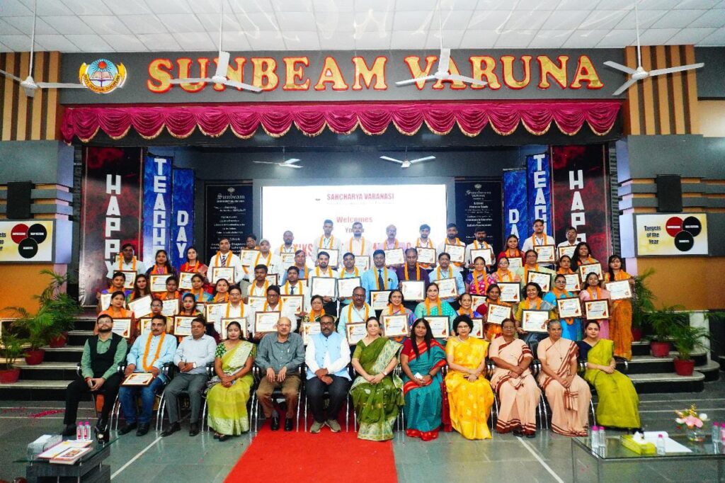 वाराणसी: सनबीम स्कूल वरुणा के ऑडिटोरियम निनाद में सहचर्या सहोदया स्कूल वेलफेयर सोसायटी वाराणसी के तत्वावधान में आयोजित शिक्षक सम्मान समारोह में शिक्षकों को शिक्षा रत्न सम्मान से सम्मानित किया गया। सर्वप्रथम मुख्य अतिथि डॉ0 अभिषेक दीक्षित रीजनल डायरेक्टर आर.सी. वाराणसी का स्वागत सहचर्या सहोदया स्कूल वेलफेयर सोसाइटी वाराणसी की अध्यक्षा डॉ0 अनुपमा मिश्रा प्रिंसिपल सनबीम स्कूल वरुणा द्वारा पुष्पगुच्छ एवं अंगवस्त्र प्रदान करके किया गया। सहचर्या सहोदया स्कूल वेलफेयर सोसाइटी वाराणसी के गणमान्य पदाधिकारीगण अध्यक्षा डॉ0 अनुपमा मिश्रा प्रिंसिपल सनबीम स्कूल वरुणा उपाध्यक्षा शशि सिंह प्रिंसिपल एशियन पब्लिक स्कूल ट्रेजरर परवीन कैसर प्रिंसिपल सनबीम स्कूल लहरतारा तथा ज्वाइंट ट्रेजरर अर्चना सिंह प्रिंसिपल सनबीम सनसिटी के स्वागत अभिनन्दन एवं दीप प्रतिस्थापन के पश्चात कार्यक्रम का शुभारंभ सनबीम वरुणा के छात्र-छात्राओं द्वारा सहचर्या गीत के साथ किया गया। तत्त्पश्चात सनबीम स्कूल भगवानपुर के छात्र-छात्राओं ने अपने नृत्य एवं मनमोहन गीतों की श्रृंखला प्रस्तुत की। उनकी मनमोहक प्रस्तुति ने दर्शकों को आनन्दित एवं भाव-विभोर कर दिया।