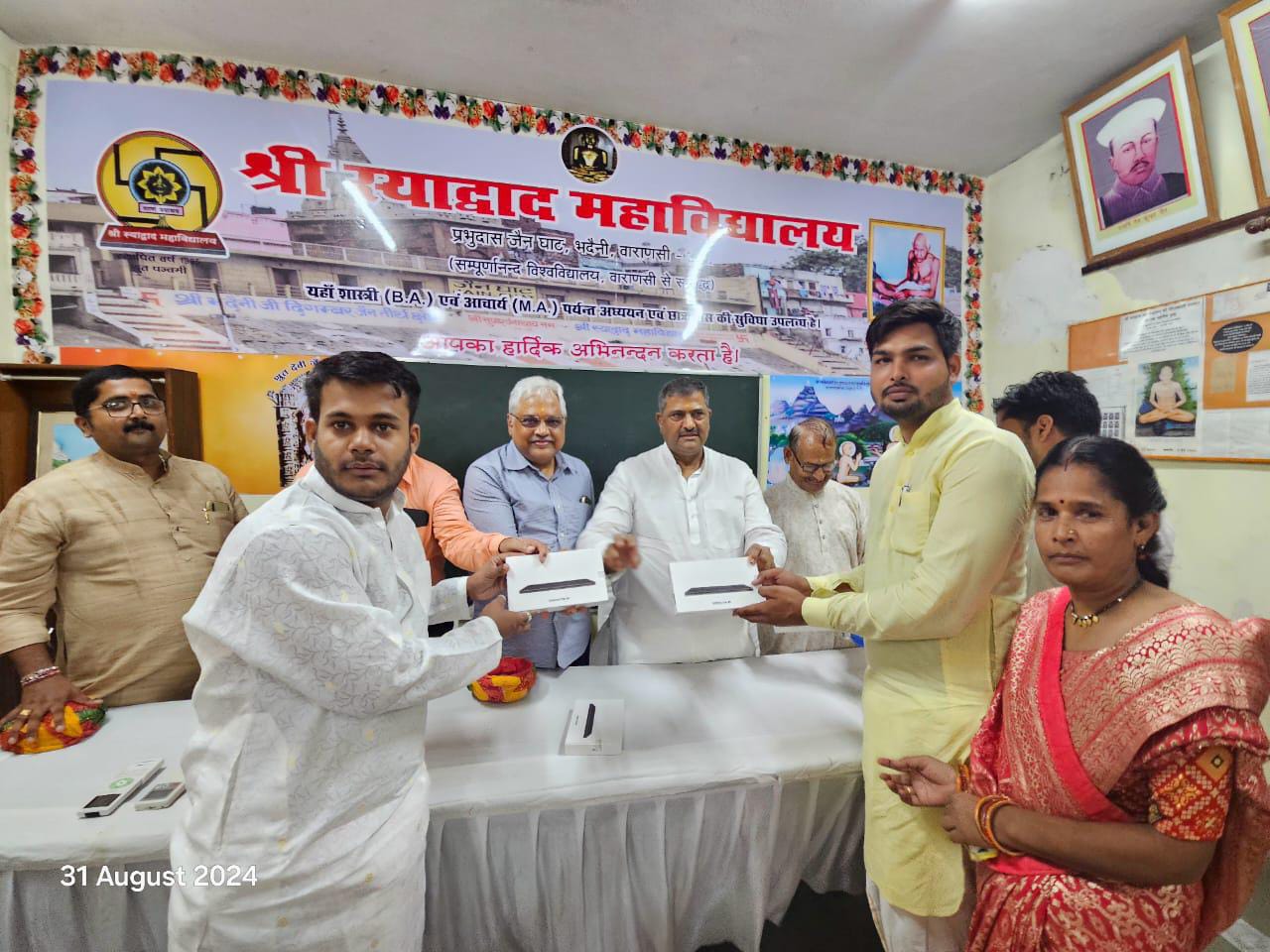 वाराणसी मे श्री स्याद्वाद महाविद्यालय भदैनी वाराणसी में उत्तर प्रदेश सरकार द्वारा स्वामी विवेकानंद युवा सशक्तिकरण योजना के अंतर्गत डॉ धर्मेंद्र सिंह सदस्य परिषद उत्तर प्रदेश में 26 आचार्य कक्षा के छात्रों को टेबलेट वितरण किये टेबलेट वितरण समारोह में मुख्य अतिथि के रूप में बोलते हुए डॉक्टर धर्मेंद्र सिंह ने कहा कि देश के प्रधानमंत्री एवं मुख्यमंत्री निरंतर युवाओं के रोजगार एवं समृद्धि के लिए तत्पर हैं संस्कृत के आचार्य तकनीकी उपकरणों से युक्त हो इसलिए यह टेबलेट वितरण किया जा रहे हैं उन्होंने संस्कृत के विद्वानों एवं विद्यार्थियों से अनुरोध किया कि हिंदू संस्कृति को एक करने के लिए कार्य करें जाति-पाति के भेद से समाज को न बटने दें उन्होंने कहा कि महावीर स्वामी ने जीवों और जीने दो का उपदेश दिया था उसी से प्रेरित होकर प्रधानमंत्री सबका साथ सबका विकास कर रहे हैं विशिष्ट अतिथि प्रो ओम प्रकाश सिंह पूर्व निदेशक मदन मोहन मालवीय हिंदी पत्रकारिता संस्थान काशी विद्यापीठ ने कहा कि इस टेबलेट वितरण से तकनीकी कौशल से जुड़कर संस्कृत के छात्र लाभान्वित होंगे एवं देश विदेश में इस टैबलेट के माध्यम से भारतीय संस्कृति की सभी सूचनाओं देश विदेश तक पहुंचाएंगे ऑनलाइन उपलब्ध दुनिया के विभिन्न भागों की सूचनाओं से अवगत होंगे। सरकार का यह कदम सराहनीय है।