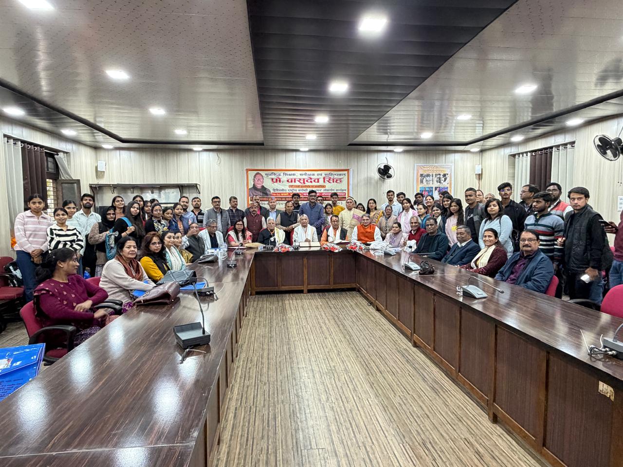 अध्यक्षता करते हुए जय प्रकाश नारायण विश्वविद्यालय, छपरा बिहार, के पूर्व कुलपति प्रो. हरिकेश सिंह ने सामाजिक, साहित्यिक और सांस्कृतिक परंपराओं को चिन्हित करते हुए कहा कि भारतीय ज्ञान परंपरा का मूल आधार समग्रता है। मां सरस्वती की प्रतिमा में वाणी, वीणा और तप तीनों का समन्वय इसी परंपरा को दर्शाता है। उन्होंने विश्वास की उत्पत्ति और विकास पर विचार रखते हुए कहा कि यहीं से भारतीय दर्शन की यात्रा प्रारंभ होती है। प्रो. भगवानदास की पुस्तकों का उल्लेख करते हुए बताया कि साहित्य और ज्ञान परंपरा के क्षेत्र में उनका योगदान अत्यंत महत्वपूर्ण है। महात्मा गांधी द्वारा भारतीय ज्ञान परंपरा की रक्षा हेतु विद्यापीठ की स्थापना तथा पांच विद्यापीठों के निर्माण का उल्लेख किया गया। विशिष्ट अतिथि प्रो. जंग बहादुर पांडे ने अर्जुन के उपदेश का उल्लेख करते हुए तत्परता, इंद्रिय-संयम और मन पर नियंत्रण की आवश्यकता पर बल दिया।